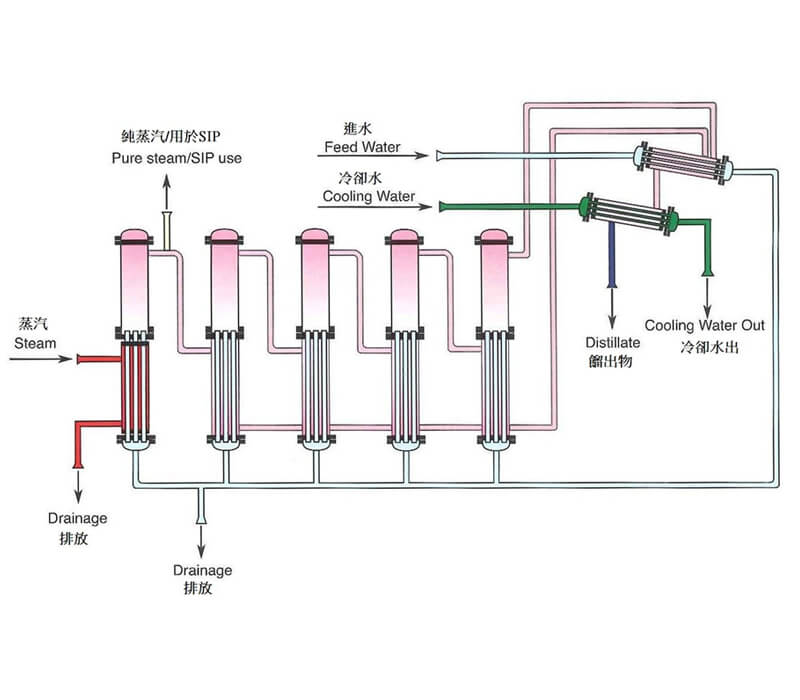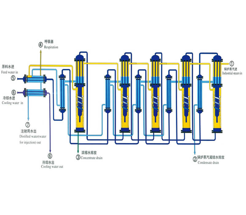 The working principle of the multi effect distilled water machine is that the fully heated raw water is evaporated and condensed by multi effect to remove non condensable gas and impurities, so as to obtain high-purity distilled water. To ensure the quality of distilled water, the raw water must be pretreated. Because of multiple effect evaporation, the heat of the multi-effect water distiller is fully utilized. Each effect evaporator adopts the principle of vertical tube type falling liquid film evaporation, plus a special structure of feed water distributor, so that the feed water of the multiple effect distillation can form a film and flow evenly in the tube. Like other pharmaceutical water purification system, the multi effect distilled water machine eliminates the dry wall phenomenon caused by uneven distribution of local feed water, greatly improving the evaporation efficiency. The multi effect distilled water machine has the characteristics of small size, light weight, large water yield, and good water quality stability.