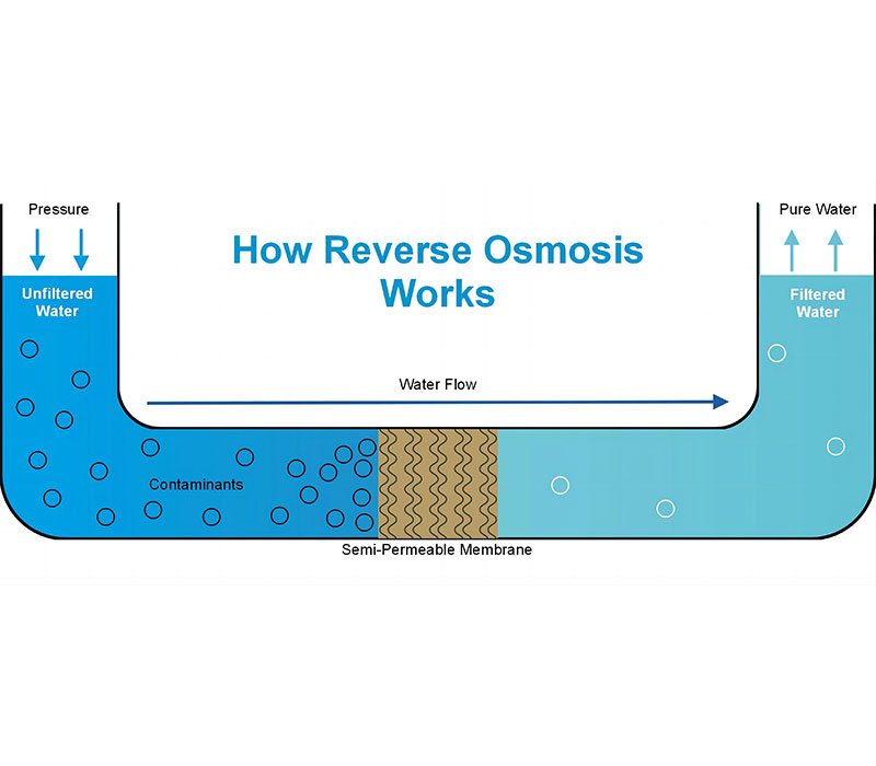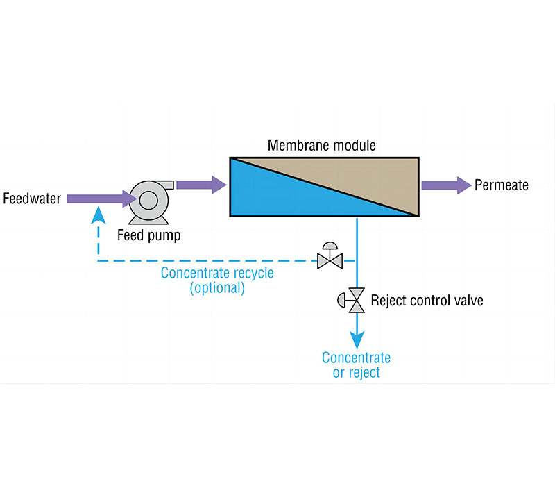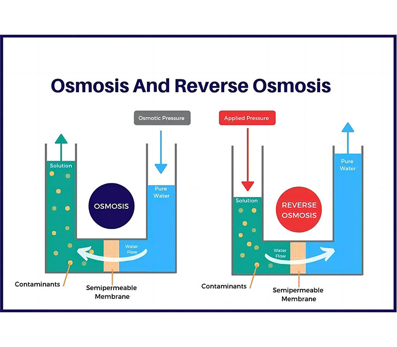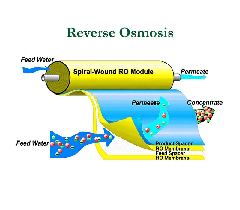 Separate the pure water from the solution containing solute with a semi permeable membrane that can only pass through water. At this time, the water on the pure water side will spontaneously pass through the semi permeable membrane and enter the solution side. The water surface on the solution side will rise. This phenomenon is penetration. When the liquid level rises to a certain height, the pressure on both sides of the membrane reaches equilibrium, and the liquid level on the solution side no longer rises. At this time, there is a pressure difference on both sides of the membrane, which is called osmotic pressure. If a pressure greater than the osmotic pressure is applied to the solution side, the water molecules in the solution will be squeezed to the pure water side. This process is just the opposite of osmosis, which is called reverse osmosis (RO). We can see from the process of reverse osmosis that due to the pressure, the water molecules in the solution enter the pure water, the amount of pure water increases, and the solution itself is concentrated.